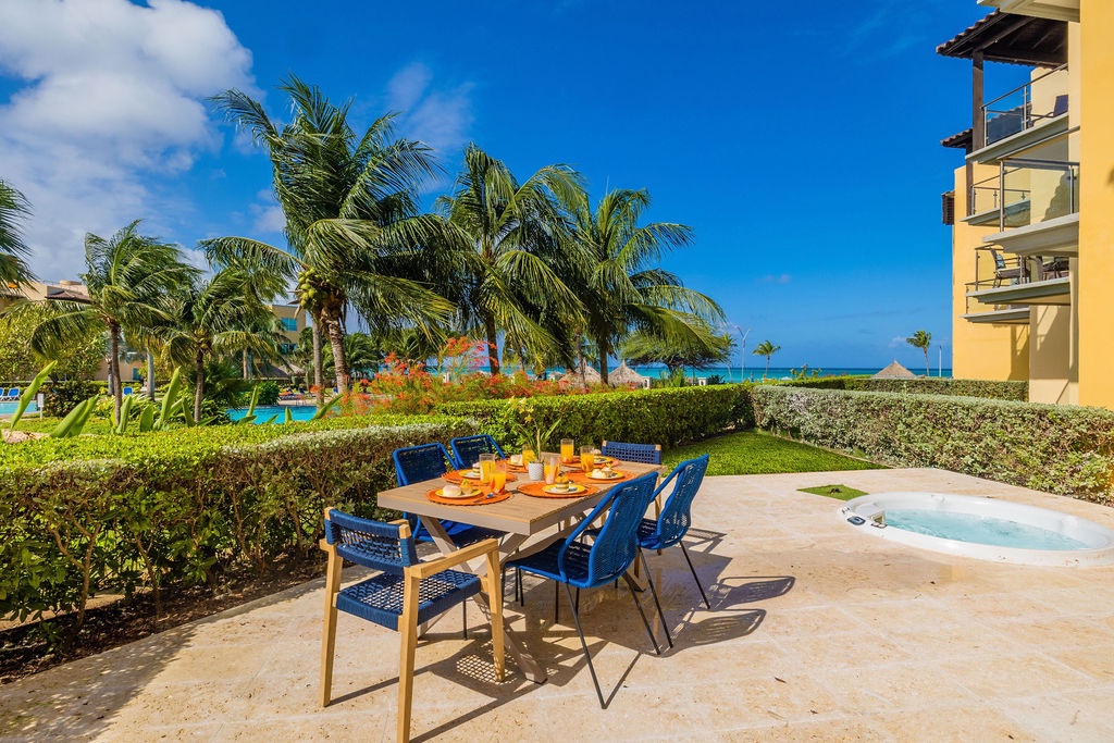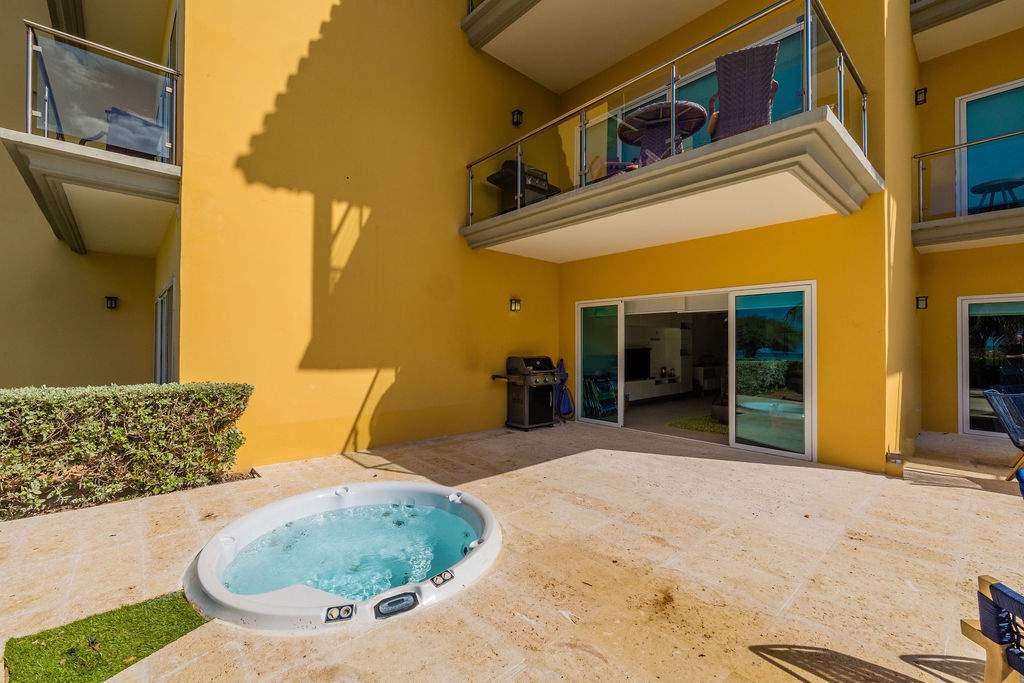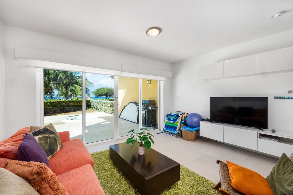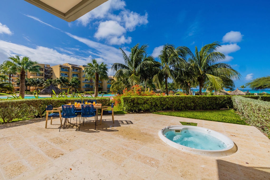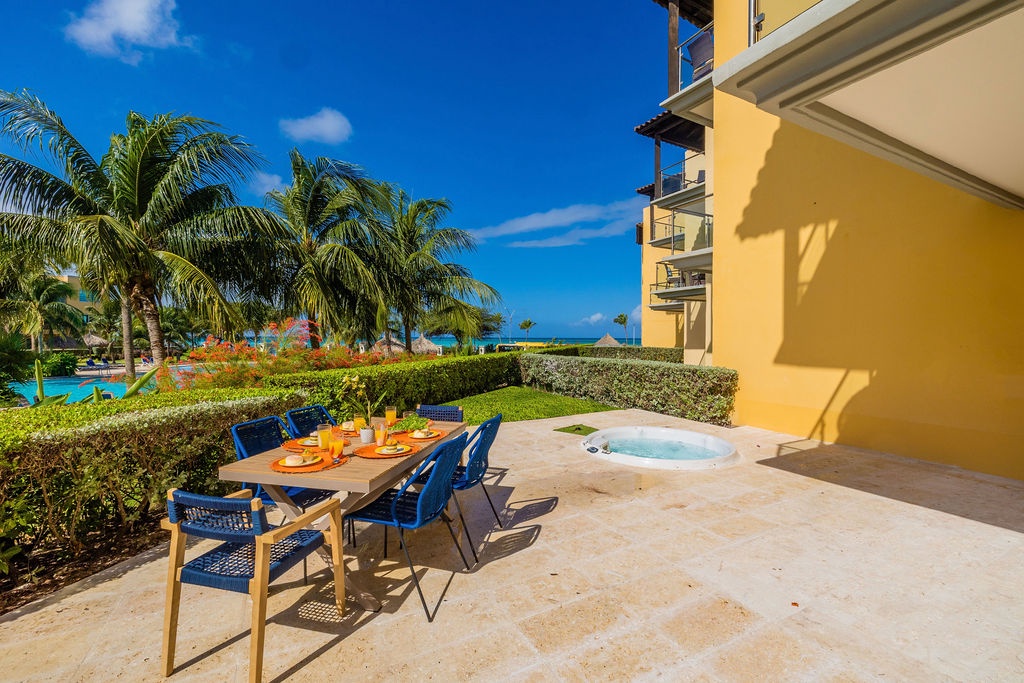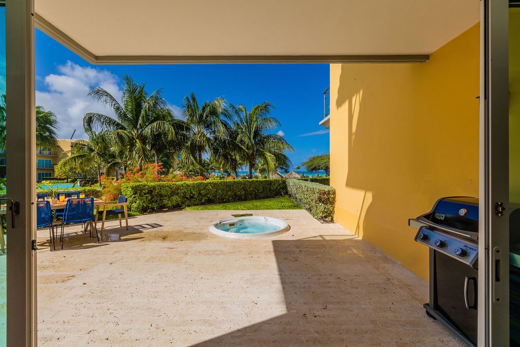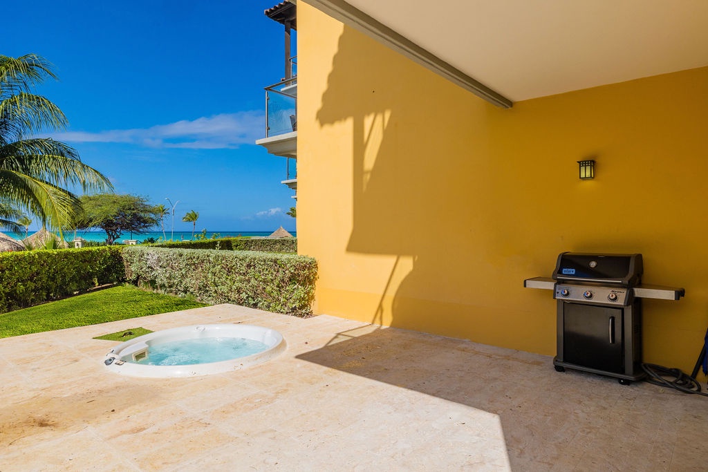 This property is colorfully decorated, ideal for a happy Aruba Vacation. Located on the ground floor it has an amazing terrace with sitting area, grill and jacuzzi at Oceania Residences.