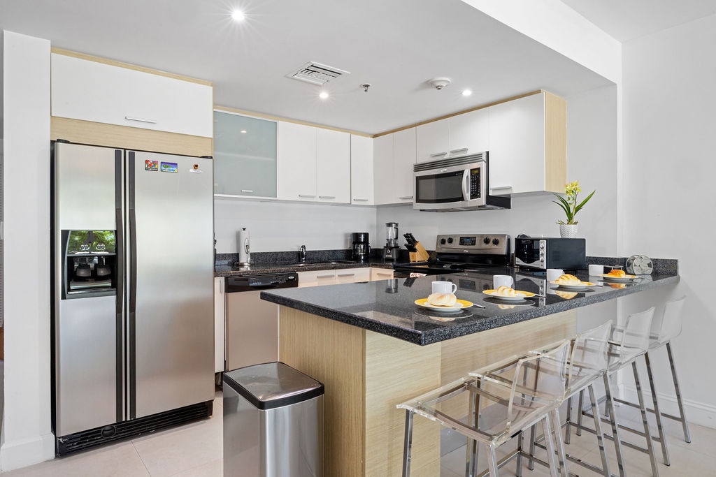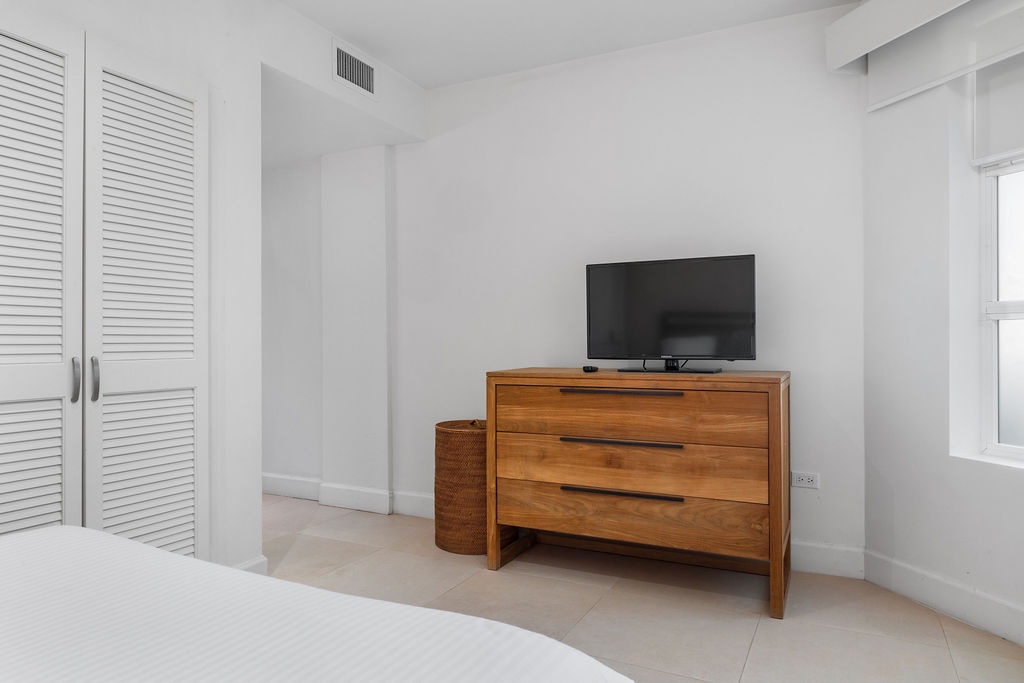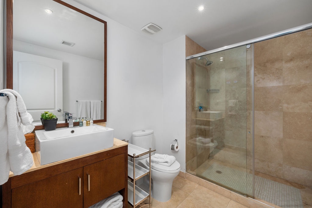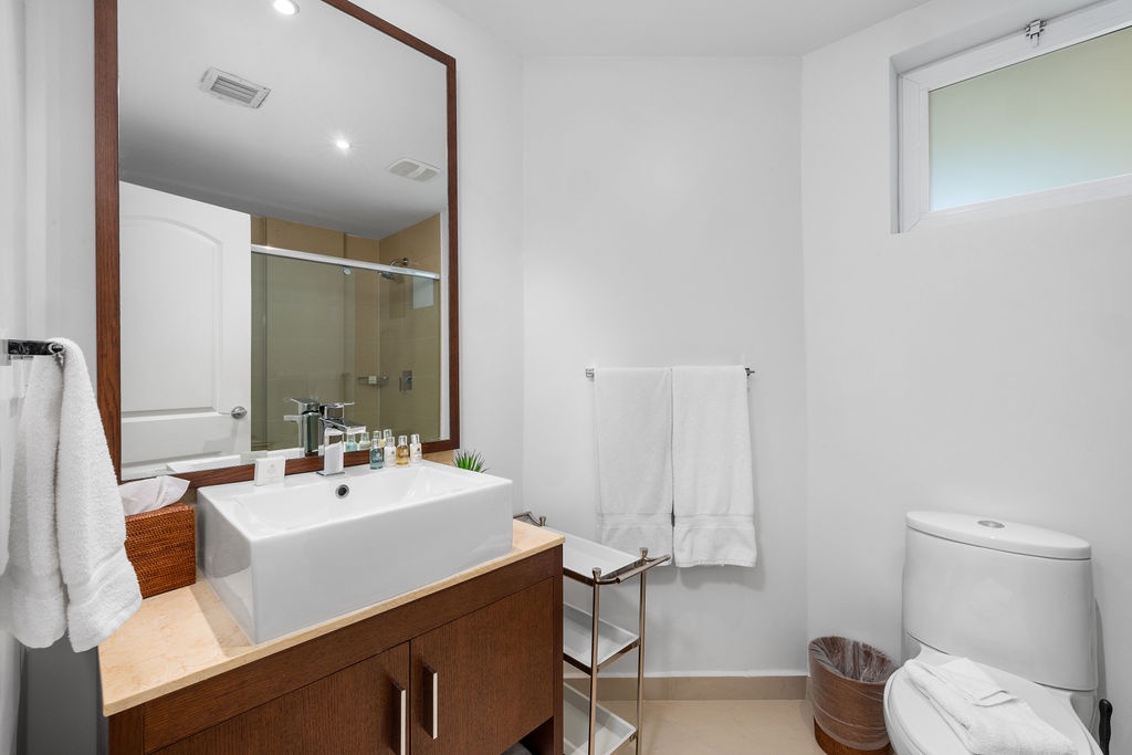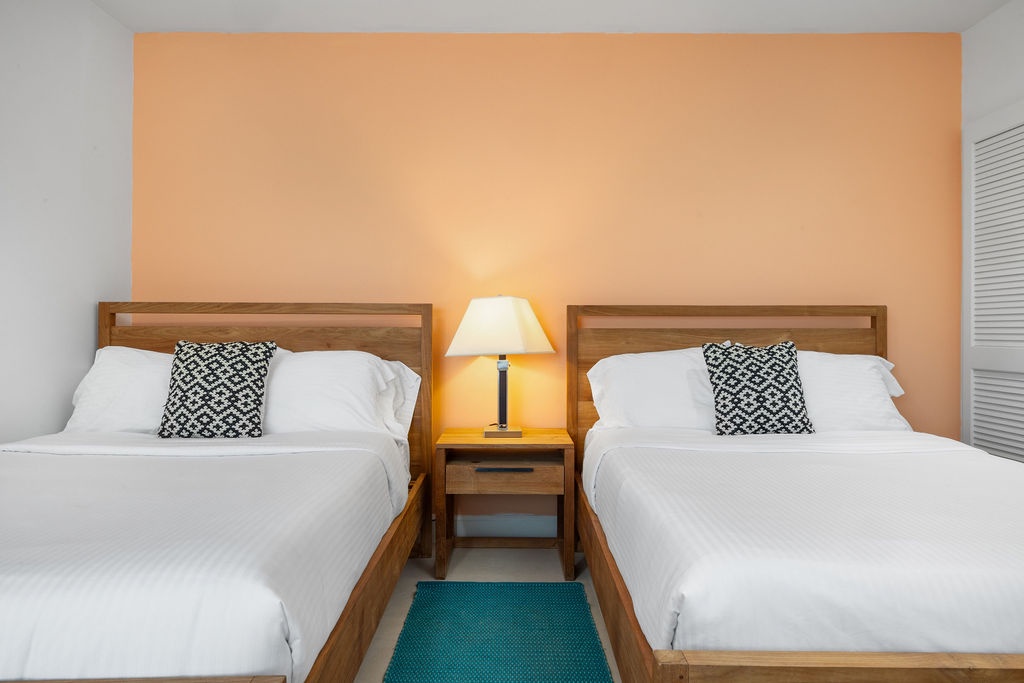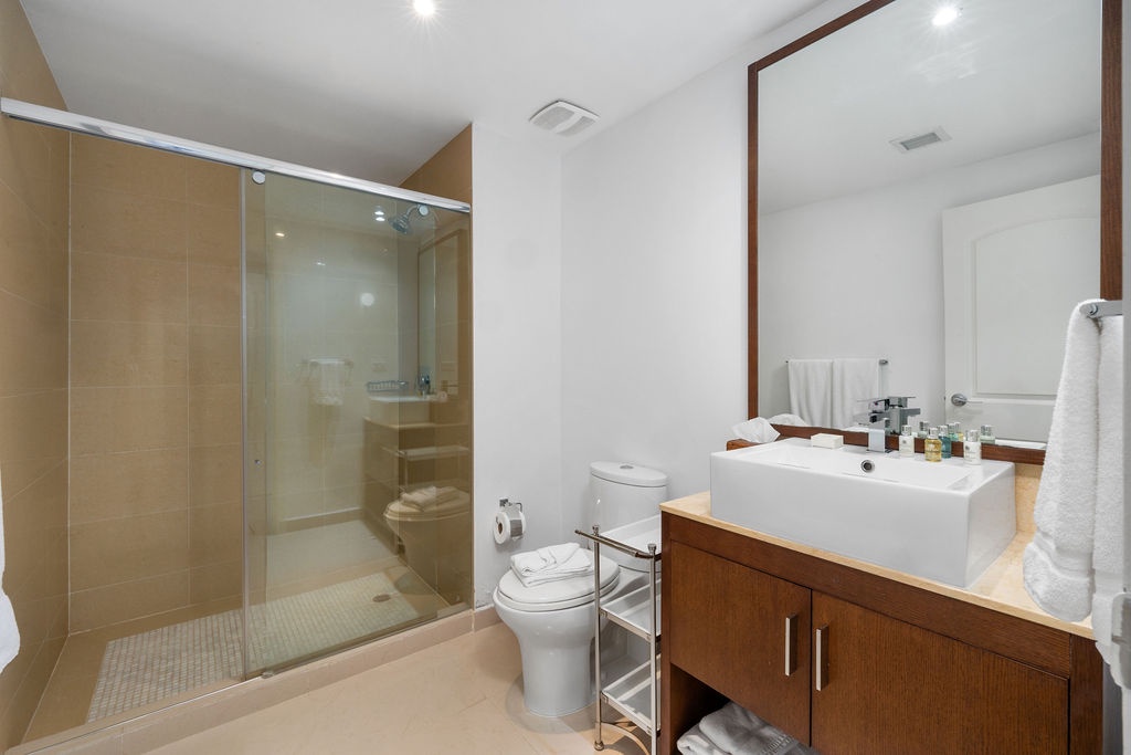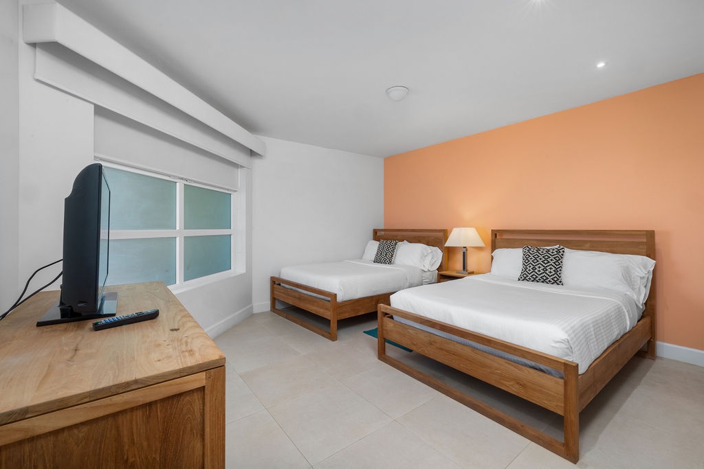 This air-conditioned two-bedroom condo has a master bedroom with one king bed and direct access to the terrace. Second bedroom with two full beds and its own bathroom. The three bathrooms with shower and hairdryer.