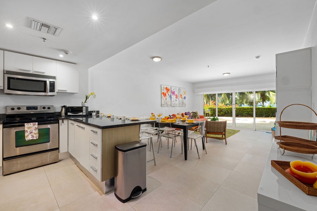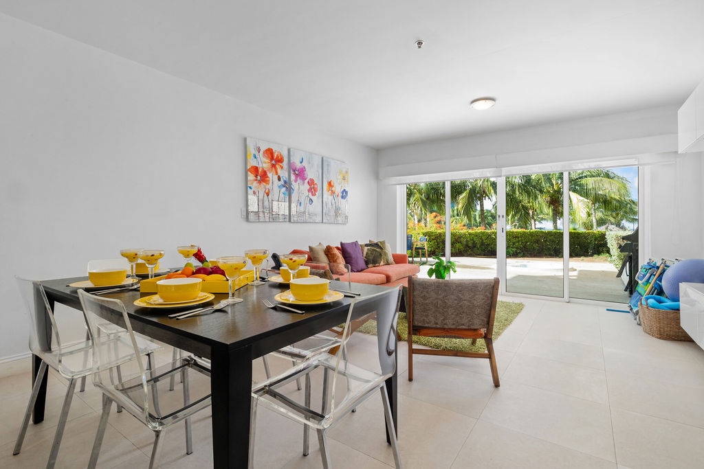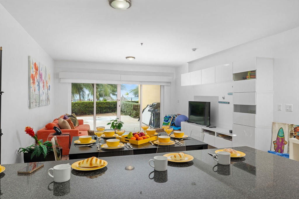 The Open floor layout is ideal for sharing with family and friends on the open kitchen and dining area. Bright colorful furniture and very well-equipped kitchen are ideal for your Aruba Vacation!